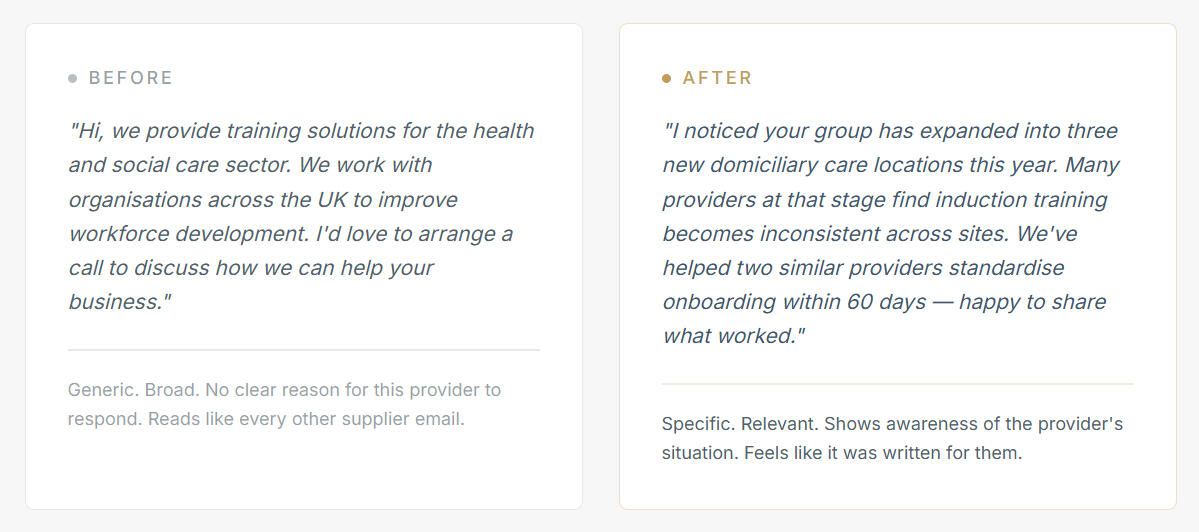 Care-home managers receive constant messages from suppliers, recruiters, consultants, and service providers.Most messages get ignored because they fail to quickly answer one question: "Why is this relevant to me?"